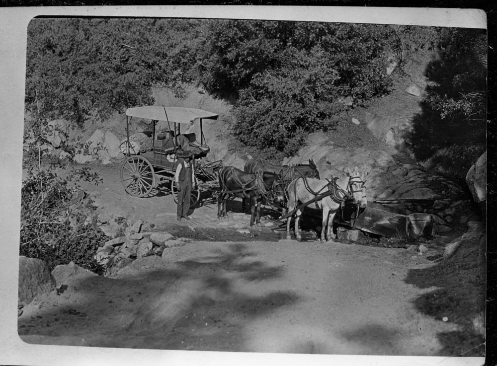 Unknown Photographer, 130810, Slapjack Creek, SNP, Vehicles and equipment, stage to Slapjack Creek, Mineral King Road. William Swanson, of Three Rivers, driver.