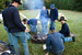 Eight white men in blue US Army unforms stand and kneel around an open fire pit cooking bacon, and boiling water in tin cups.