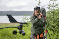 A park ranger scientist tends to a microphone at a sound station.