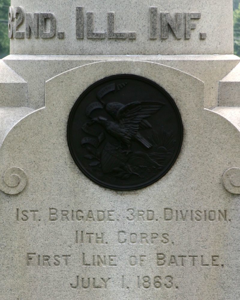 1 of 4 Monuments to Illinois. Marks 1st line of battle held by 82nd Illinois before retreating to East Cemetery Hill. Located on W Howard Ave near Wheeler's Battery. || 1 Mn. Smooth base 5' sq. Smooth shaft with excised inscription & detailing, bronze medallion in lower part of shaft. Topped w/curved, cylindrical cap. All 12'6" H. Small chips in base.