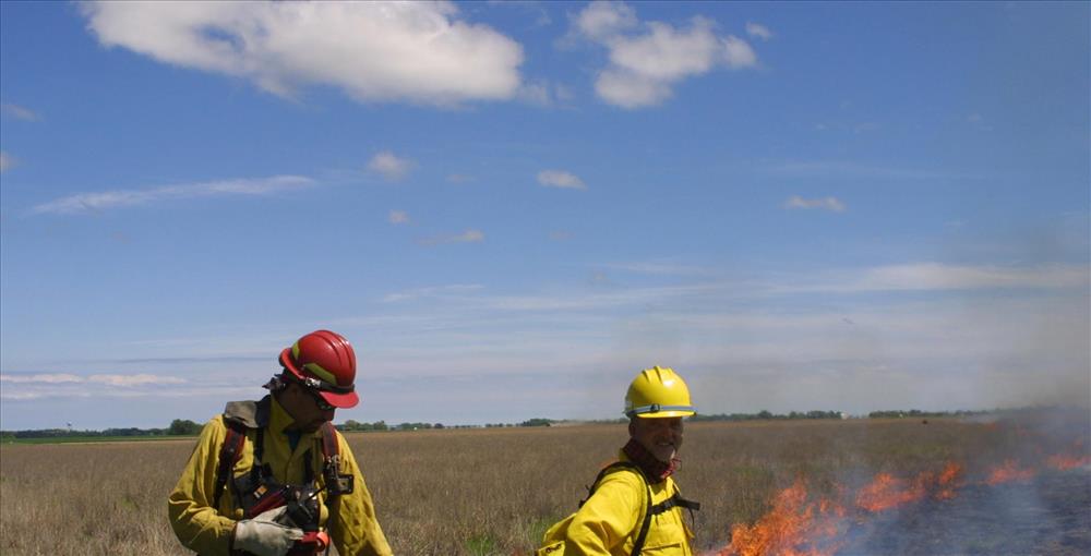 Two members of fire crew at the fire line with Ft. Larned in the background.