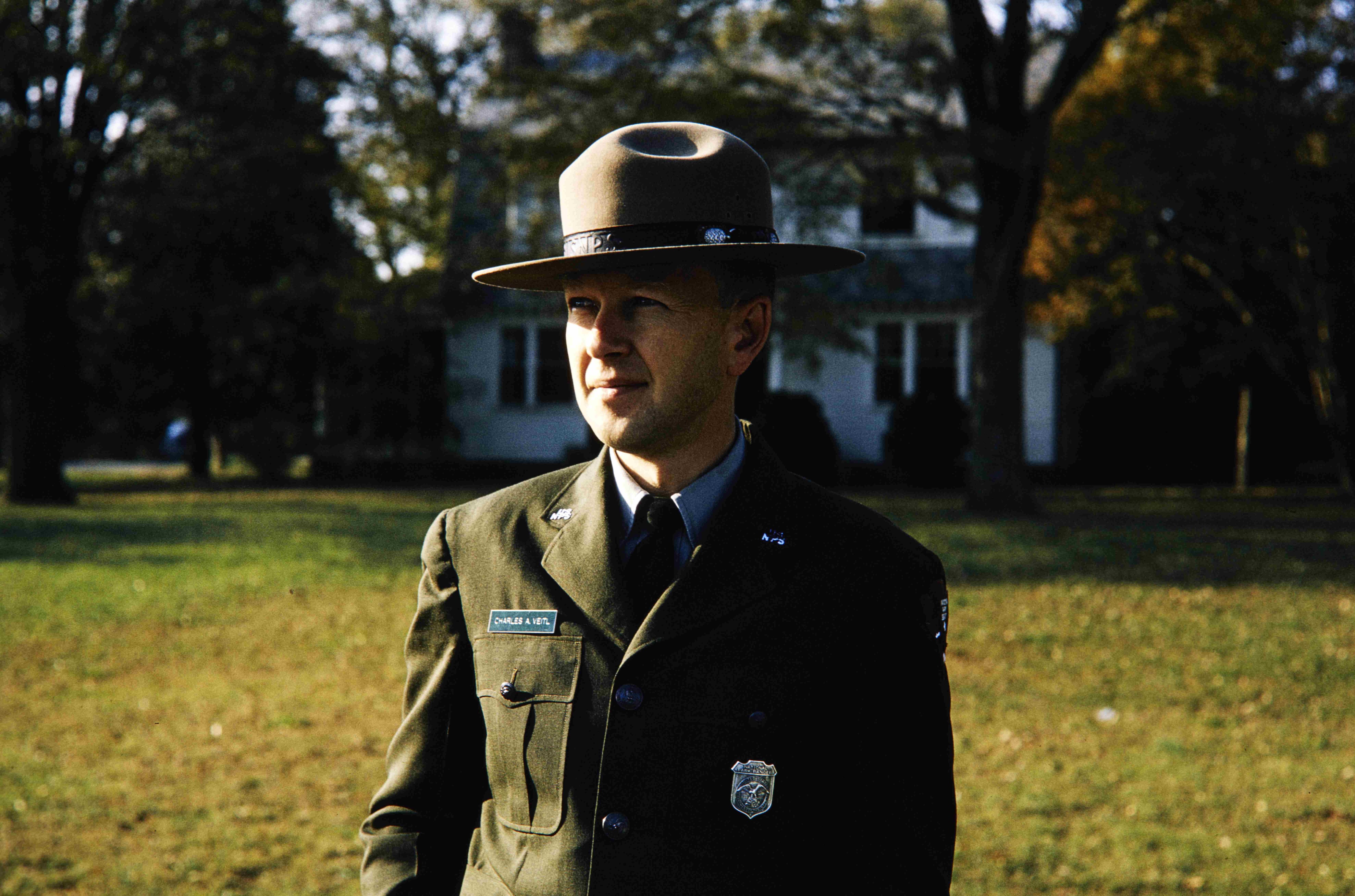 NPS employee, Charles A. Veitl standing in front of a building in Yorktown Battlefield in Colonial National Historical Park.
