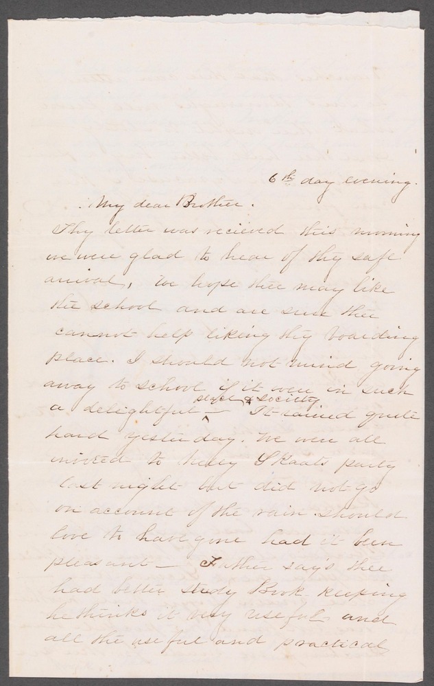 "6th day evening. My dear Brother Thy letter was recieved this morning we were glad to hear of thy safe arrival. We hope thee may like the school and are sure thee cannot help liking thy boarding place. I should not mind going away to school if it were in such a delightful place & society. It rained quite hard yesterday. We were all invited to [Nelly] Skaats party last night but did not go on account of the rain should love to have gone had it been pleasant – Father says thee had better study Book Keeping he thinks it very useful and all the useful and practical branches thee can attend to he says Burroughs will know what thee ought to study --- And thee had better buy a pair of slippers in Syracuse if thee can find them to suit thee. Little Willie has been quite sick since thee left he has not been to school since Fourth-day – he had a sore throat and fever is some what better to-night he says send a kiss to brother Richard and tell him to send me one in his next letter. Has cousin Libbie finished that piece she was painting I mean the fruit _______ Richard and Theodore Underhill returned last night I believe. Richard starts for his home in Philadelphia next Second-day – Tell cousin Lizzie that mother has not found the pocket handkerchief we made for thee yet and she wishes to know if thee thinks three shirts will be enough for thee until Christmas. Mother is making the same now and if thee can not get along without them she will try and find an opportunity to send them to thee. I have written thee quite a letter and I will close perhaps Sarah will write a few lines with much love to all I remain thy affectionate sister Mary" "Dear Brother As Mary has left a little room for me I will try to fill it although she has told about all the news. We like our new Teacher very much her name is Miss Densmore she has a gold cross for a medal and the one that has the most Credit marks for the week wears it – I think it is a very good plan. Lillias Gay wears it next week, thee must excuse the blot as it was an accident of mine, I hope thee will like it in Syracuse did thee get a seat in the school room or does thee study at Cousin Lizzie’s room. I have been doing sums this evening and dont feel much like writing so I guess I will close, and try to write a longer one next week, do write every week and if thee has time we would be very glad to hear from thee more than that. Mother and Father send their love to thee and Cousins Lizzie and Burroughs with much love to all I remain as ever thy affectionate Sister Sallie Seventh-day evening P.S. we have found thy Physiology does thee think thee will want it this term. Thee can get it when thee comes home Josiah Letchworth is at Uncle George’s I do not know how long he is going to stay – Sarah.”