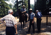 NPS employees with one on horseback talking to visitors in Petersburg National Battlefield.