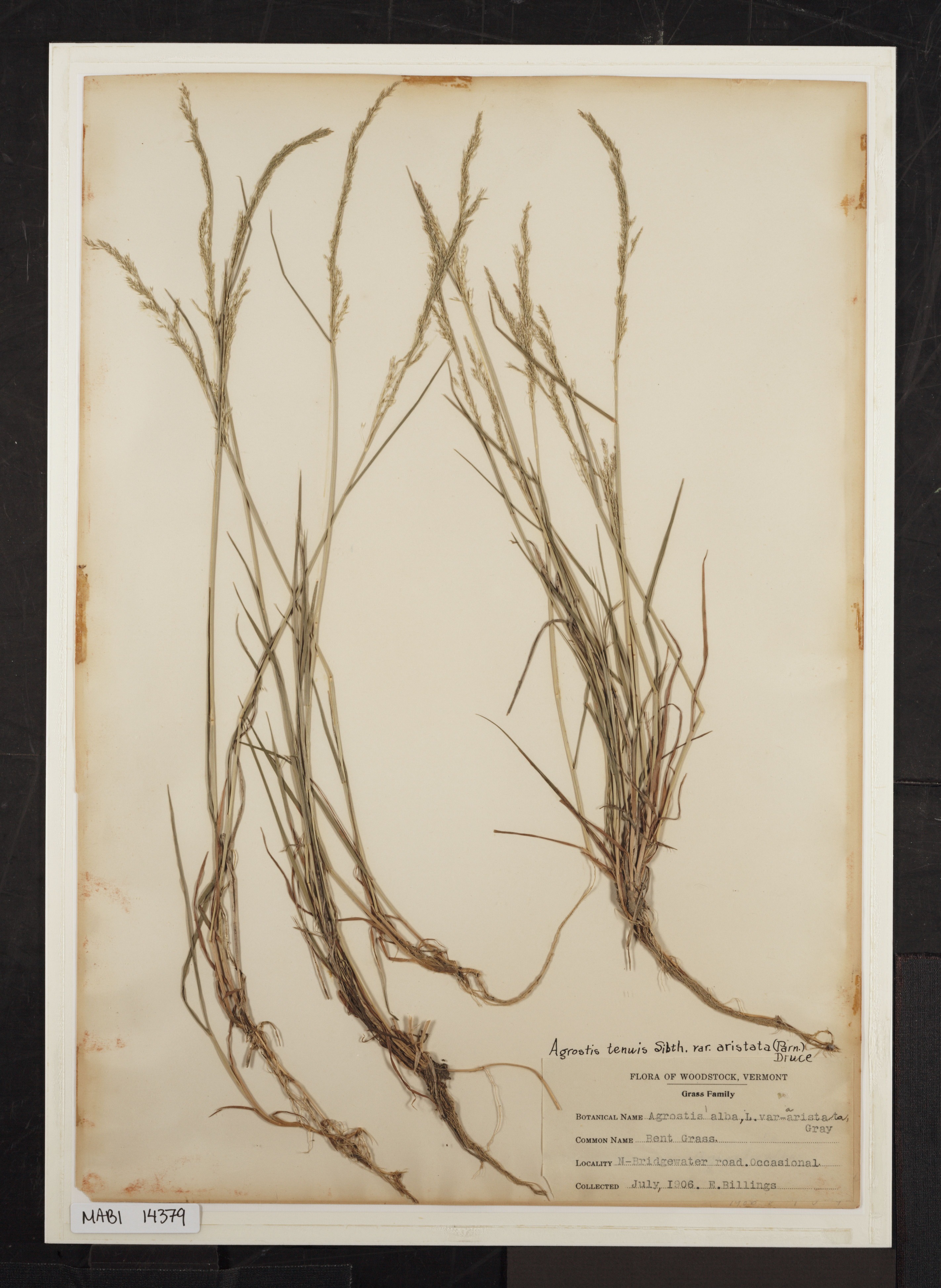 Preserved Specimen On A3 Paper With A Printed Label Identifying It In The Bottom Right Corner. The Paper Is Mounted On A Larger Cardboard And Covered With Plastic Which Is Sealed To The Board. There Are Four Sample Clump, Each With Roots, Stems, Leaves And Seeds. The Species Was Originally Identified As Agrostis Alba Var. Aristata. This Was Corrected Later And There Is A Handwritten Note Above The Label With Gives The Species Name Of Agrostis Tenuis Var. Aristata.