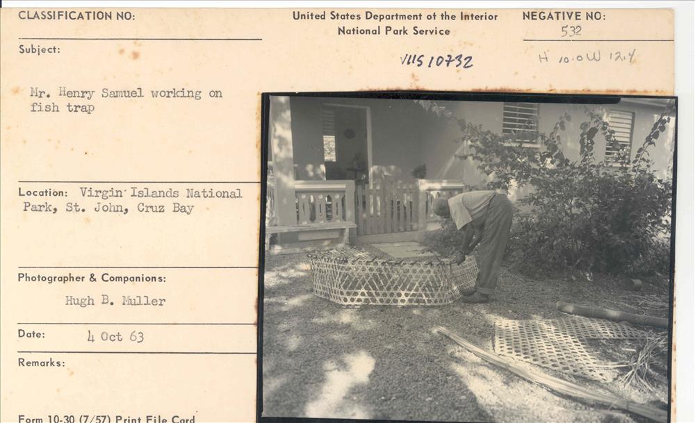Mr. Henry Samuel demonstrating how to construct a fishtrap made of Teyer Palm, native to the Virgin Islands. His son is watching in image catalogue No. 10736