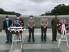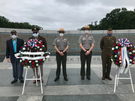 Veterans and Park Rangers stand in solidarity by a memorial wreathe at the World War II memorial.