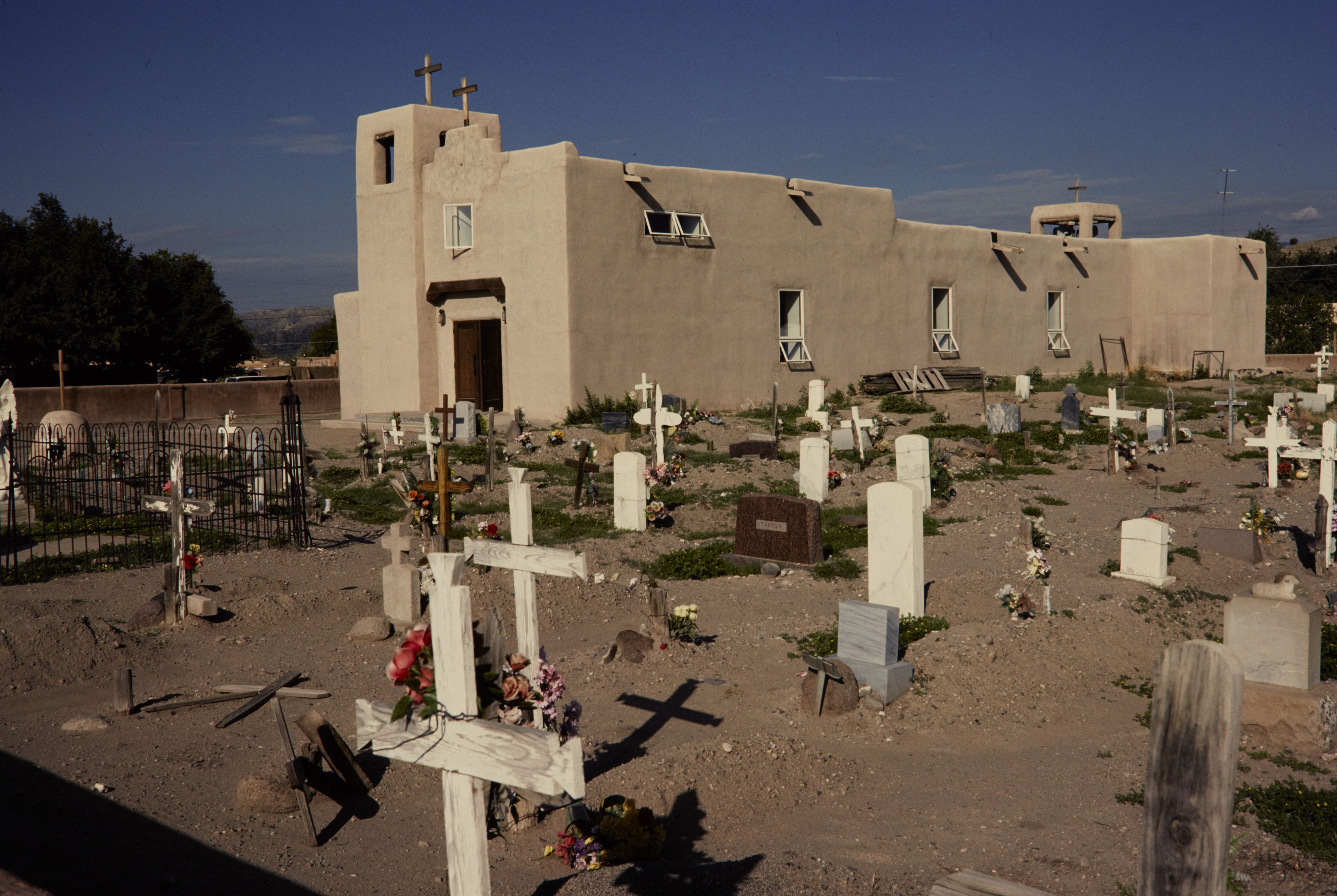 Cemetary in front of an adobe church.