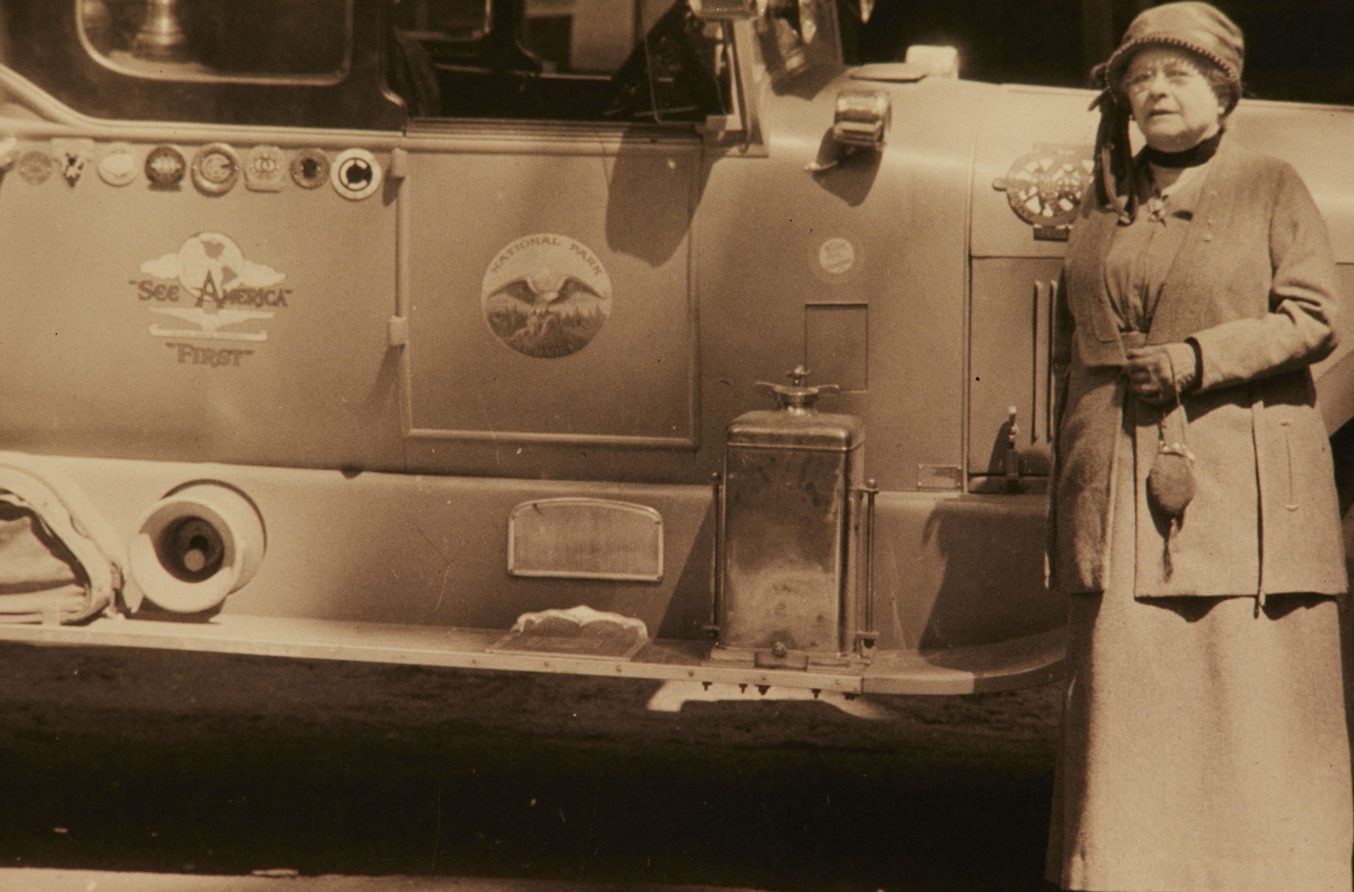 Woman standing next to a NPS Vehicle with "See American First" sticker on it in Sequoia and Kings Canyon National Parks.