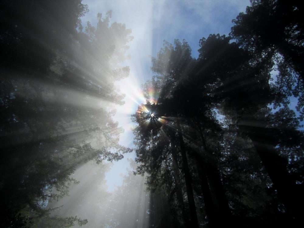Sun beaming through the foggy coastal redwood forest, Redwood National and State Parks, 2015.