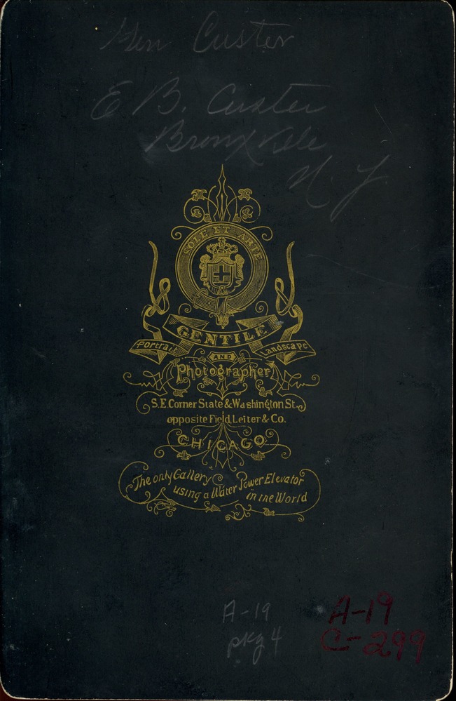 LIBI_00019_00299; This item is an original albumen cabinet card of General George A. Custer in standing view. The photograph is 3 7/8 x 5 9/16" (4 1/4 x 6 1/2" mounted) and was produced circa 1873 by Gentile of Chicago, Illinois. The photographer's stamp is printed on the front bottom edge. On the verso, the photographer's stamp is printed in light ink on the dark background. A handwritten notation written in pencil is barely visible and reads, "Gen. Custer - E.B.C. Bronxville, N.Y" in Mrs. Custer's handwriting.Photograph reprinted in "The Custer Album" by Lawrence A. Frost, page 52, and "Custer in Photographs" by D. Mark Katz, page 63.; Cabinet Card [Card Photograph]; Courtesy of the National Park Service, Little Bighorn Battlefield National Monument, LIBI_00019_00299, Carlo Gentile, "General George Armstrong Custer Standing in Military Uniform Wearing His Hat," circa 1873
