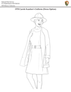 Coloring page of Carole Scanlon's 1970 NPS uniform. She wears the thigh-length jacket open over dress option with belt and the women's broad-brimmed hat.