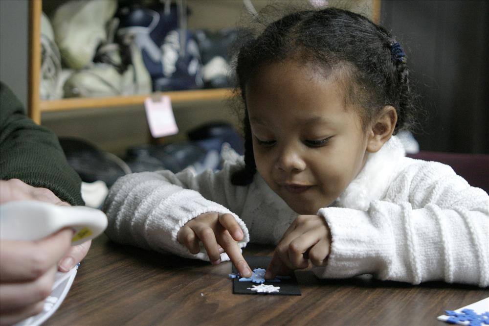 Children make crafts with Park Ranger Paul Motts inside the Winter Sports Shelter. Families enjoy hot drinks. SCA intern provides information to visitors. || During the winter months, the Kendall Lake Shelter becomes CVNP's Winter Sports Center. Services include cross-country ski and snowshoe rentals and winter recreation programs.