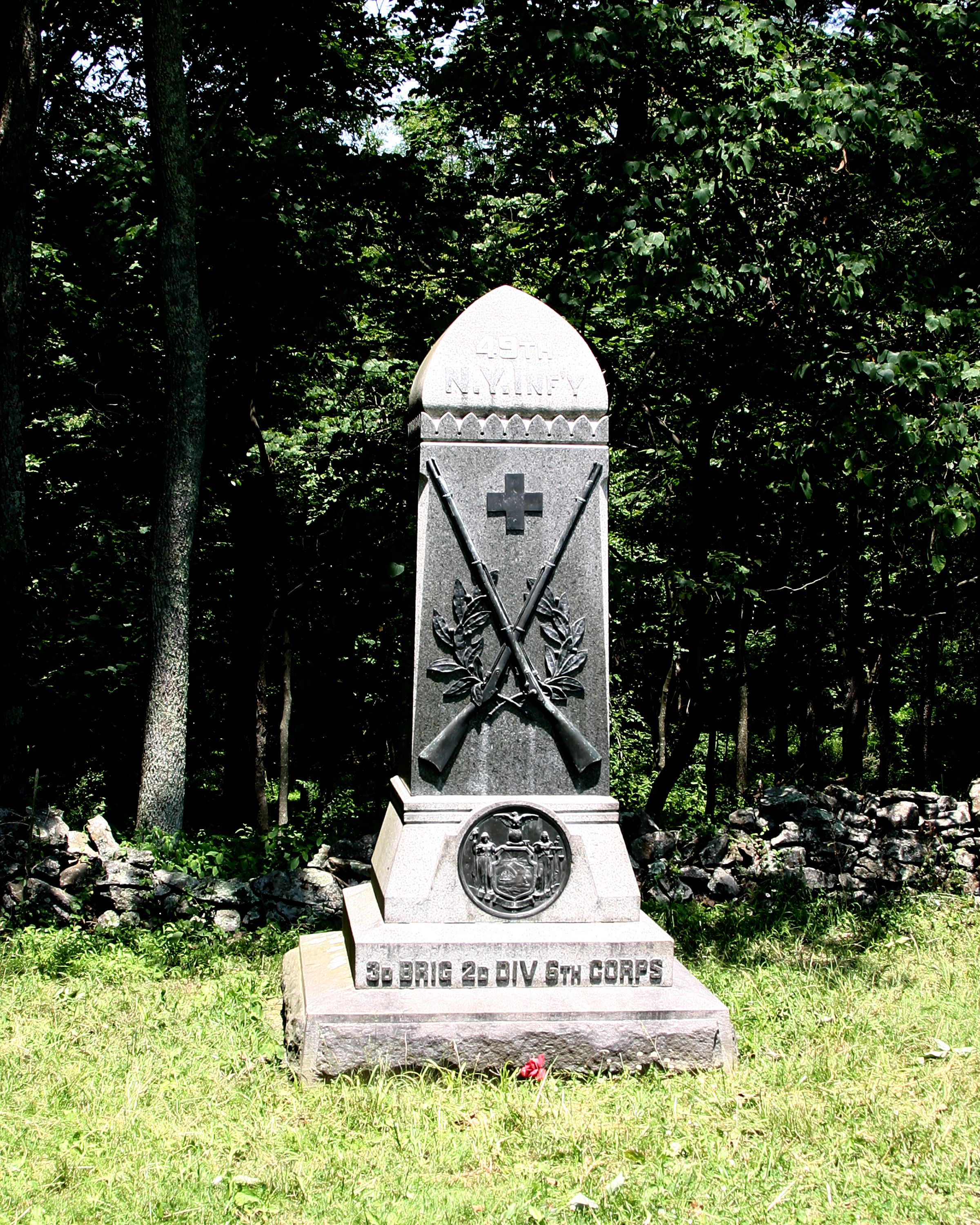 1 of 90 Monuments to New York. Indicates position held July 3, 1863. LF&RF markers N-S of Mn. Mn located on Neill Avenue. || Mn & 2 flank markers. Mn base 6'8"sq rough cut tooled edge. 3 part stepped/tapered shaft smooth cut & polished face. Polished excised inscription. Bronze medallion, crossed guns, wreath & Corps sumbol. Concave cap. All 10'6"H. Markers 1 cu. ft.