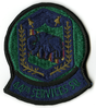 Green circular with black border and dark blue tab at bottom with 44TH SERVICES SQ" in green. In circle is blue shield with smaller green shield in center with blue bison and red olive and blue stripes behind. Olive branches on either side of center shield wrapping around bottom. Top has two (2) olive arrows one pointing away from each side of top."
