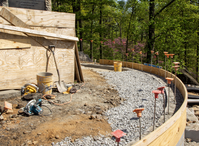 A dirt and gravel path with boards, metal construction stakes, and construction equipment sits to the right of a monument with trees and large rocks in the background.