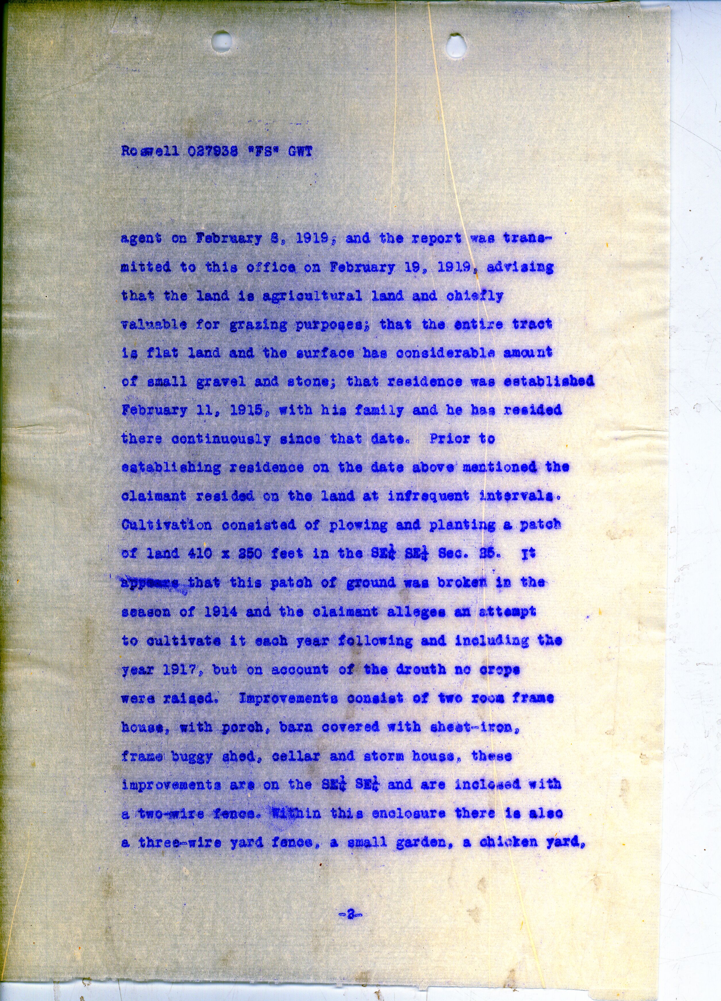 agent on February 8, 1919, and the report was transmitted to this office on February 19, 1919, advising that the land is agricultural land and chiefly valuable for grazing purposes; that the entire tract is flat land and the surface has considerable amount of small gravel and stone; that residence was established February 11, 1915, with his family and he has resided there continuously since that date. Prior to establishing residence on the date above mentioned the claimant resided on the land at infrequent intervals. Cultivation consisted of plowing and planting a patch of land 410 X 250 feet in the SE ¼ SE ¼ Sec. 35. It appears that this patch of ground was broken in the season of 1914 and the claimant alleges an attempt to cultivate it each year following and including the year 1917, but on account of the drouth no crops were raised. Improvements consist of two room frame house, with porch, barn covered with sheet-iron, frame buggy shed, cellar and storm house, these improvements are on the SE ¼ SE ¼ and are inclosed with a two-wire fence. Within this enclosure there is also a three-wire yard fence, a small garden, a chicken yard,
