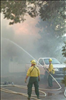 Fire fighters use hoses to battle structural fires during the Long Mesa fire at Mesa Verde National Park, summer 2002.