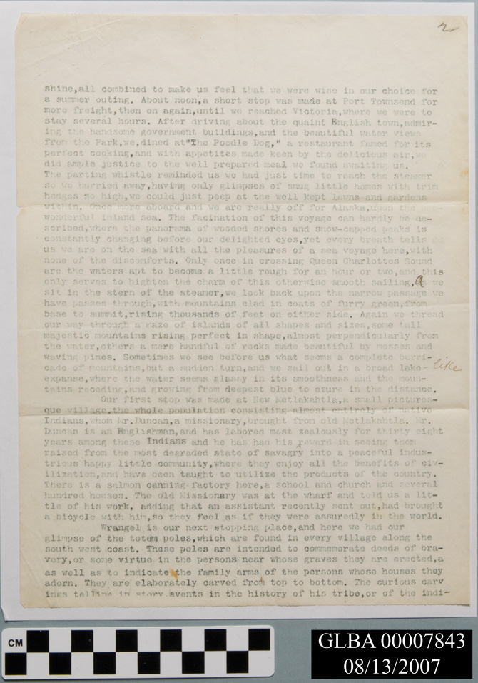 Five page typed Letter by Florence Smith describing Glacier Bay from a steamship tour in 1863. Florence was a relative of Rusty Yerxa who donated the letter in 2007.