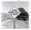 Road sign reading 'Down Grade Next 5 Miles' in Kolob Canyon. ; ZION Museum and Archives Image 007.01.01-56of73 ; ZION 15933
