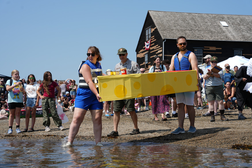 Cardboard boats prepare to race in Salem Harbor.