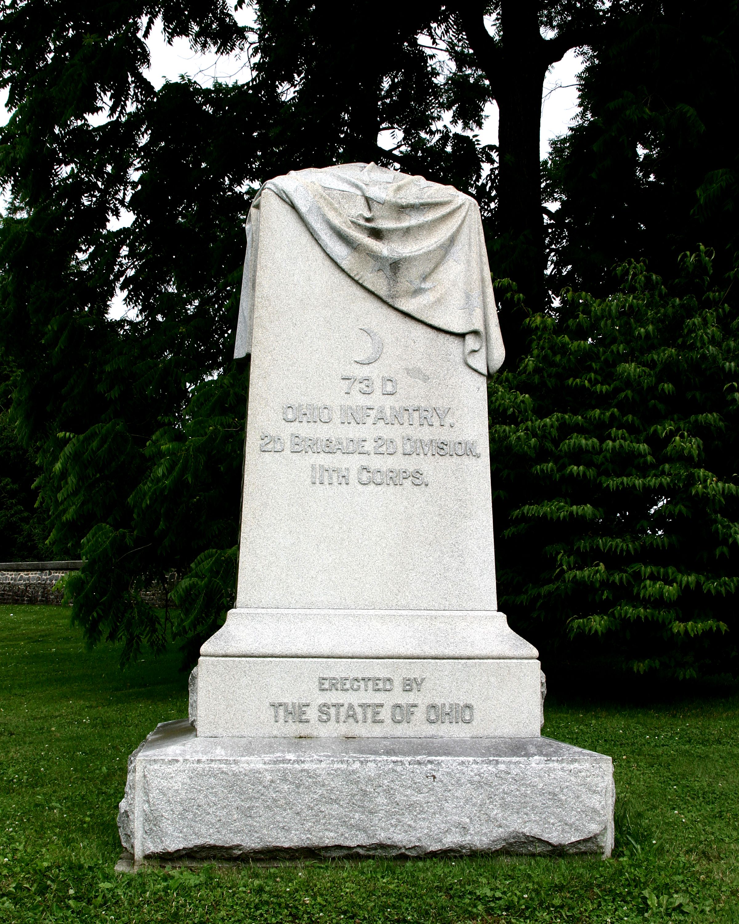 1 of 20 Mns in Park to Ohio commands in Gettyburg Campaign. Marks position held by infantry during July 1 - 3, 1863. Mn moved approx 90' w/in bounds of National Cemetery Annex, near center line held by regiment. || Mn & 2 flank markers. Mn base 6' sq rough cut. 2 part shaft, 1st part w/excised polished letters. 2nd w/excised polished letters front, sides polished w/incised inscriptions. Pryamid top w/sculptured draped flag. All 10'6"H. LF&RF: 1'sq x 2'H.