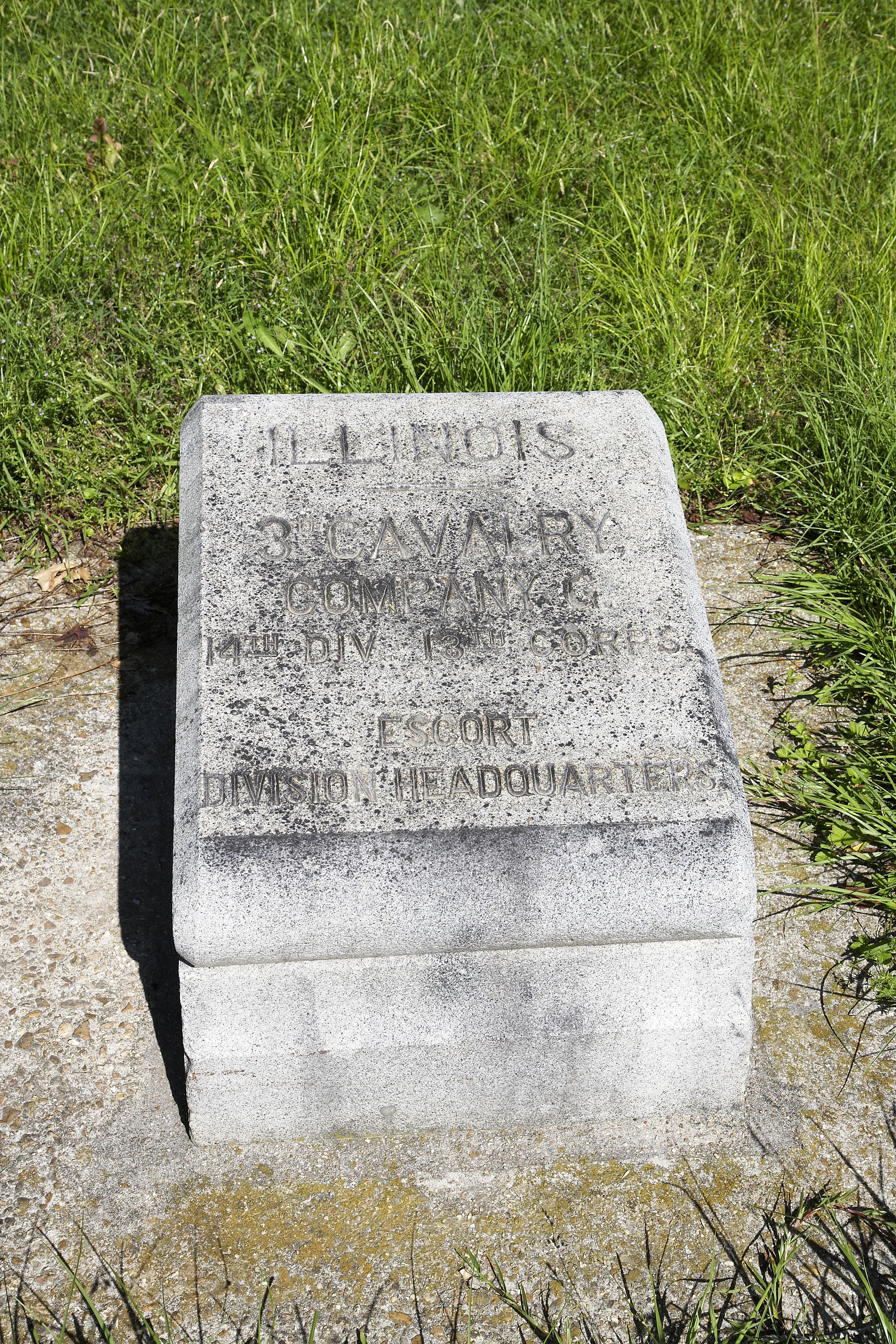 22" x 29" x 16" gray granite marker consisting of a nearly horizontal, scroll-form tablet with beveled sides and inscribed with "ILLINOIS" and unit designation.