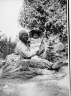 Lucy Brown surrounded by basket materials and Great Granddaughter Alice Roosevelt Wilson in a Miwok cradleboard. (Fig. 262, p. 140 Traditions & Innovations).
