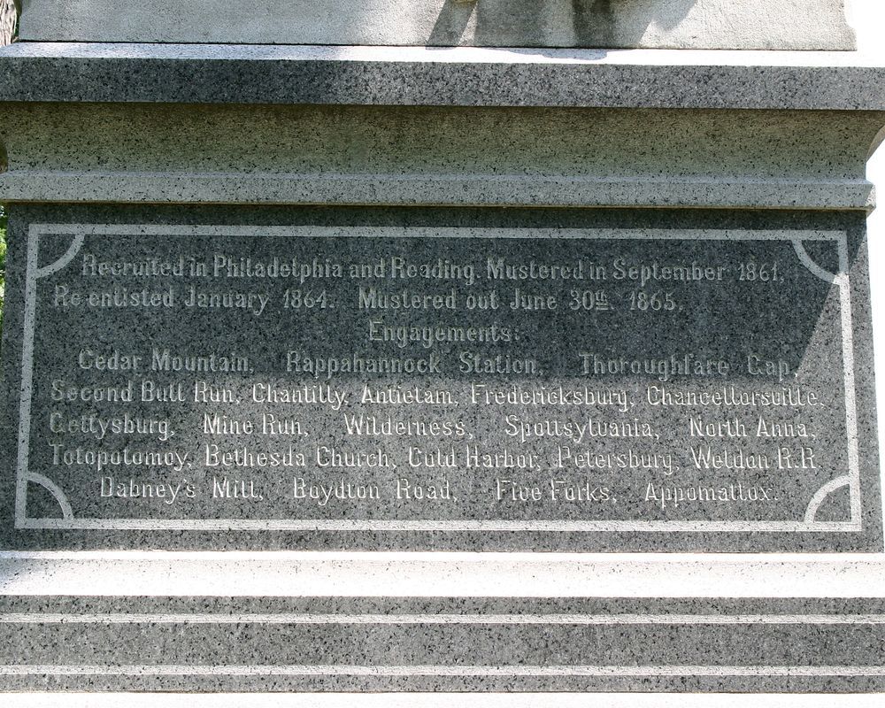 Marks location of 88th PA on July 1, 1863, p.m. July 1 marker in Forney Field. July 2-3 marker on Hancock Ave, July 3-5 marker in Zeigler Grove. 1 of 110 Mns in Park to PA commands in Gettysburg. Located on W side of Doubleday Ave, N of Robinson Ave || Mn, 2 flank markers, 3 position markers. Rough hewn base, 7'4"X4'. Polished inscribed shaft, 5'10"x2'6". Topped w/ sculpted eagle & infantry accoutrements. Bronze state seal tablet at E. Flat top flank markers, 1'x1'x1'5". Position markers 2'x1'x3'3"