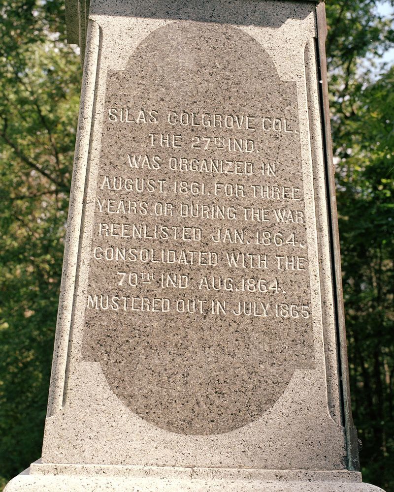 1 of 6 Monuments to Indiana. Indicates scene of charge into Confederate line morning July 3, 1863. LF&RF markers located 313' & 270' SW & S of Mn, respectively. Position marker located in Meadow. Mn N side Colgrove Avenue. || Mn, 2 flank, 1 position. Mn base 4'sq. 2 part shaft, 1st smooth w/polished excised lettering, 2nd smooth/polished w/incised lettering 3 sides, bronze tablet 4th. Flemish cross gable & pryamid cap. All 7'9"H. Flanks 1'sq x1'2"H, Pos. 1'sq x 2'H.