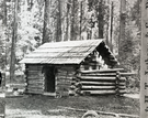 Mariposa Big Trees Cabin - built in 1885. Report of Commissioners for Yosemite Valley and Mariposa Grove of Big Trees, 1886, says "Last year a comfortable and artistic log cabin was erected --- in the grove." Original print in the over-sized photo drawer i