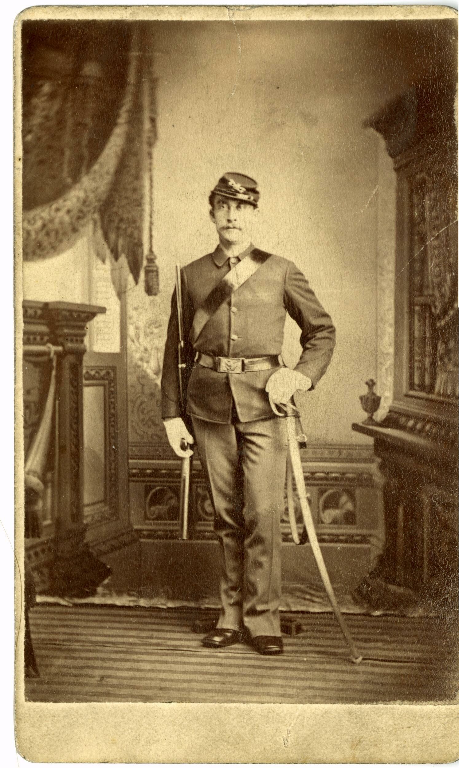 Courtesy of the National Park Service, Little Bighorn Battlefield National Monument, LIBI_00312_11140, Orlando Scott Goff, "Captain John McGuire in Uniform Standing at 'Carry Arms' Position," circa 1880