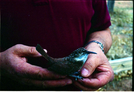 Color Photo of wooden Canyon Wren added to museum in January 1995, and the carver, Charles Foote. ; ZION Museum and Archives Image 201_06_04003 ; ZION 15933