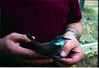 Color Photo of wooden Canyon Wren added to museum in January 1995, and the carver, Charles Foote. ; ZION Museum and Archives Image 201_06_04006 ; ZION 15933