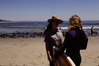 NPS employee, Susie Cutler, talking to a women holding a surf board in Santa Monica Mountains National Recreation Area.