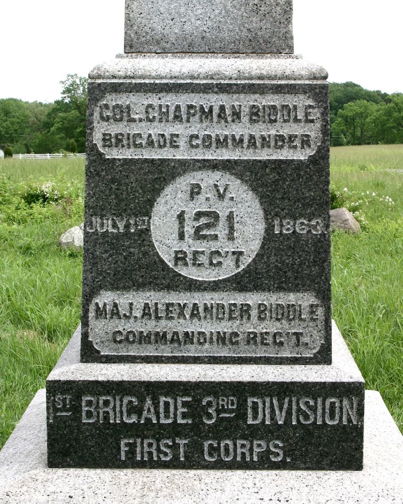 1 of 110 Pennsylvania Mn. Indicates position held by 121st Infty July 2-3, 1863. Located E side Hancock Ave S of US Regulars Mn. || Mn, base 3'6.5"sq. 3 part shaft. 1st part polished face w/incised letters. 2nd polished faces w/incised inscriptions all sides. 3rd finished stone obelisk. Topped by granite ball. All 11'3"H. Moved to present in-line location 1888-89.
