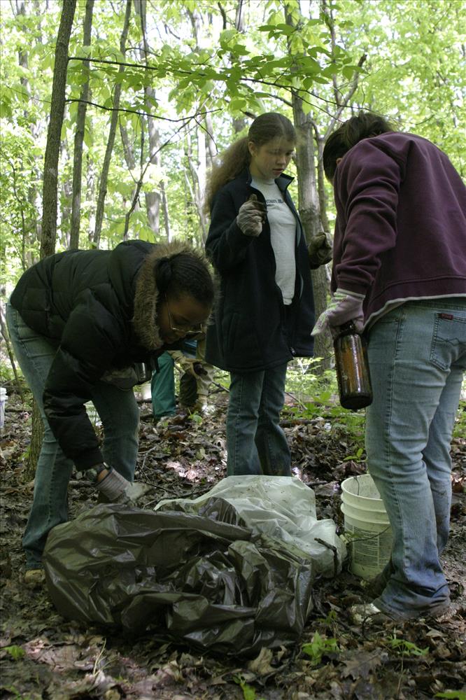 RiverDay is an an annual day of service and celebration in the Cuyahoga Watershed. Activities are coordinated by Friends of the Crooked River. Cuyahoga Valley National Park is a partner. Our volunteers remove trash from dump sites in several locations and invasive plants from the area around Howe Meadow. || Girl scout and other volunteers remove garbage from one of several trash dump sites on RiverDay 2006.