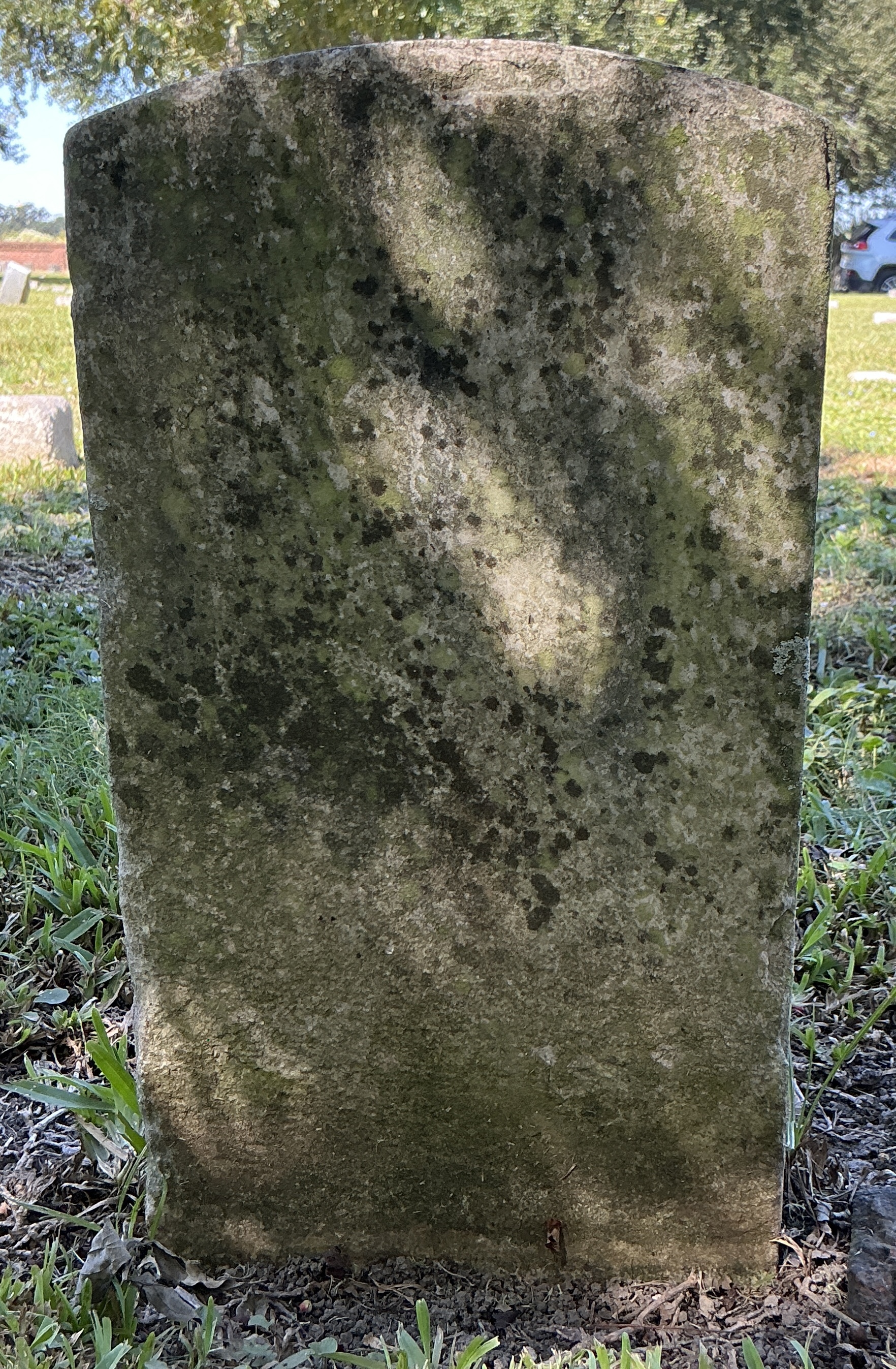 Back of historic upright marble headstone with recessed shield face.