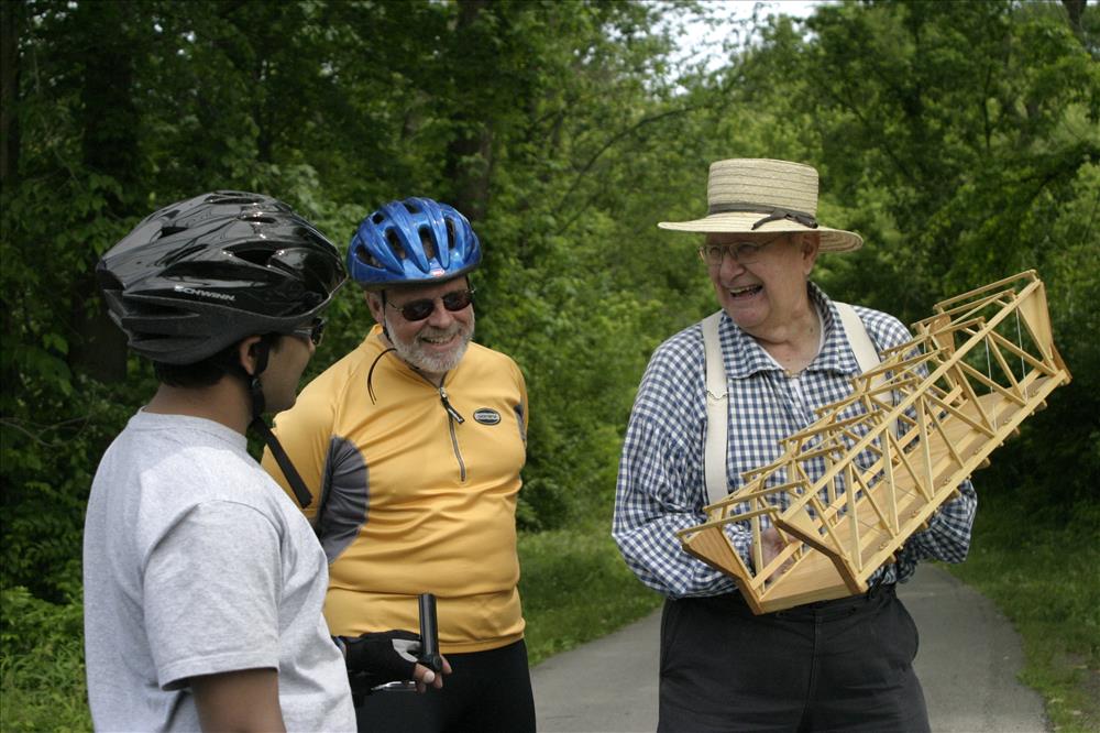 Cuyahoga Valley National Park offers a variety of interpretive programs throughout the year. Historical programs like this one interpret 19th century life in northeast Ohio. || A costumed park volunteer interprets the historic Station Road Bridge which crosses the Cuyahoga River. This is one of several stations in a program that started on the Cuyahoga Valley Scenic Railroad then visitors biked back along the Towpath Trail where they met various park rangers and volunteers interpreting transportation history in the region.