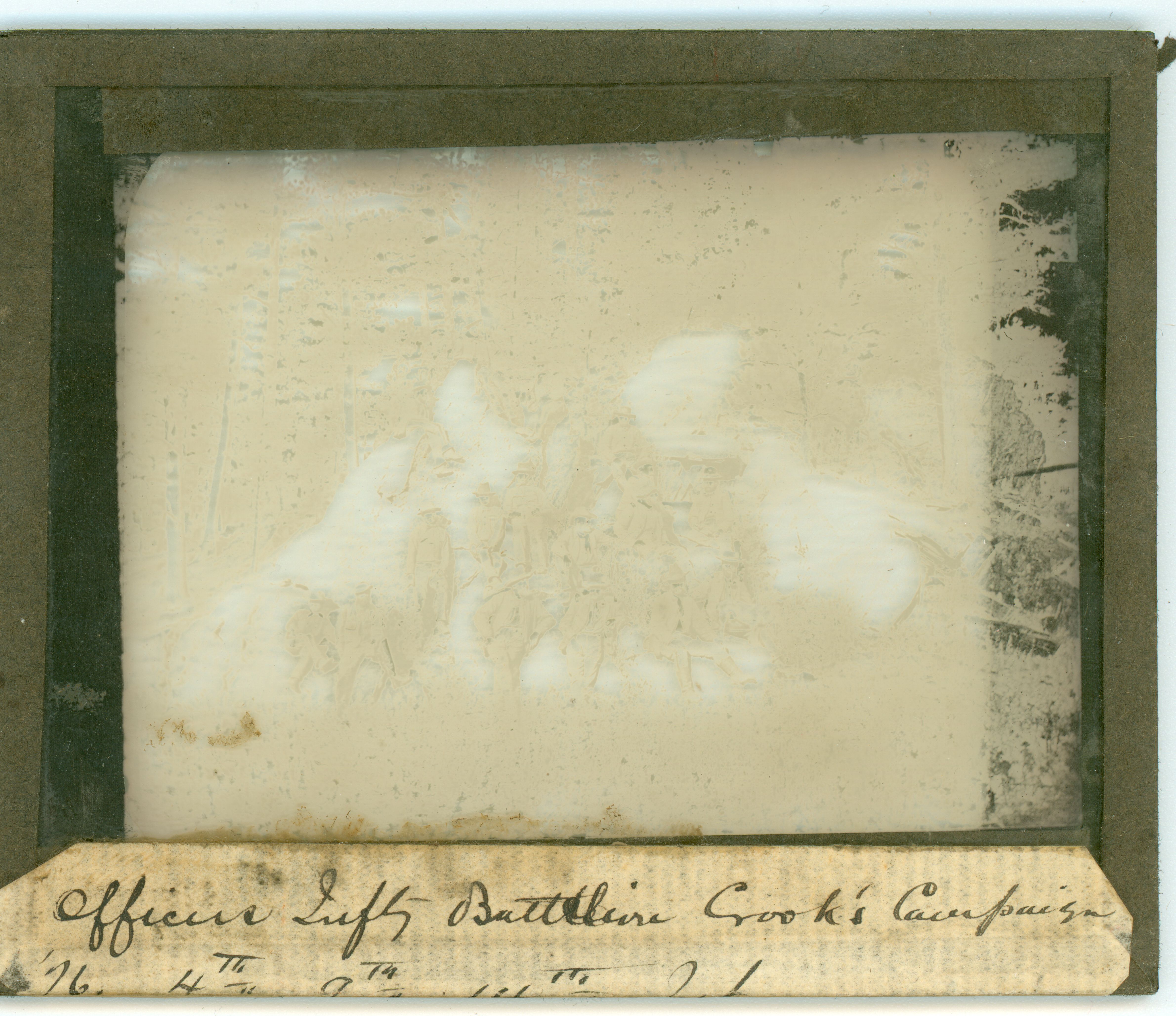 LIBI_00030_01525; A lantern-slide (glass transparency), "Another Group of Officers with Crook, 1876”. This image depicts a group of Crook's officers from the 4th, 9th, and 14th infantry while on the Rosebud Campaign, 1876. The image is very light. On verso a handwritten note in ink along the bottom of the mount reads, “Officers [illegible] [illegible] Crook’s Campaign…”It was produced by an unknown photographer. [Bowen No. 221.]; transparency, latern-slide [photographic material]; Courtesy of the National Park Service, Little Bighorn Battlefield National Monument, LIBI_00030_01525, Unknown Photographer, "Officers from the 4th, 9th, and 14th Infantry with George Crook on the Rosebud Campaign," 1876
