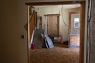 The parsonage interior, with old carpet still visible and construction materials on the floor.