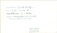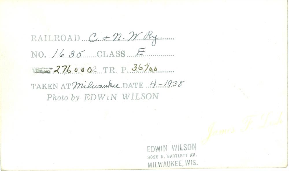 Information stamped on back C&N.W. Railroad No. 1635 class EWGT. 276000 TR.P.36700 Taken at Milowakee Date