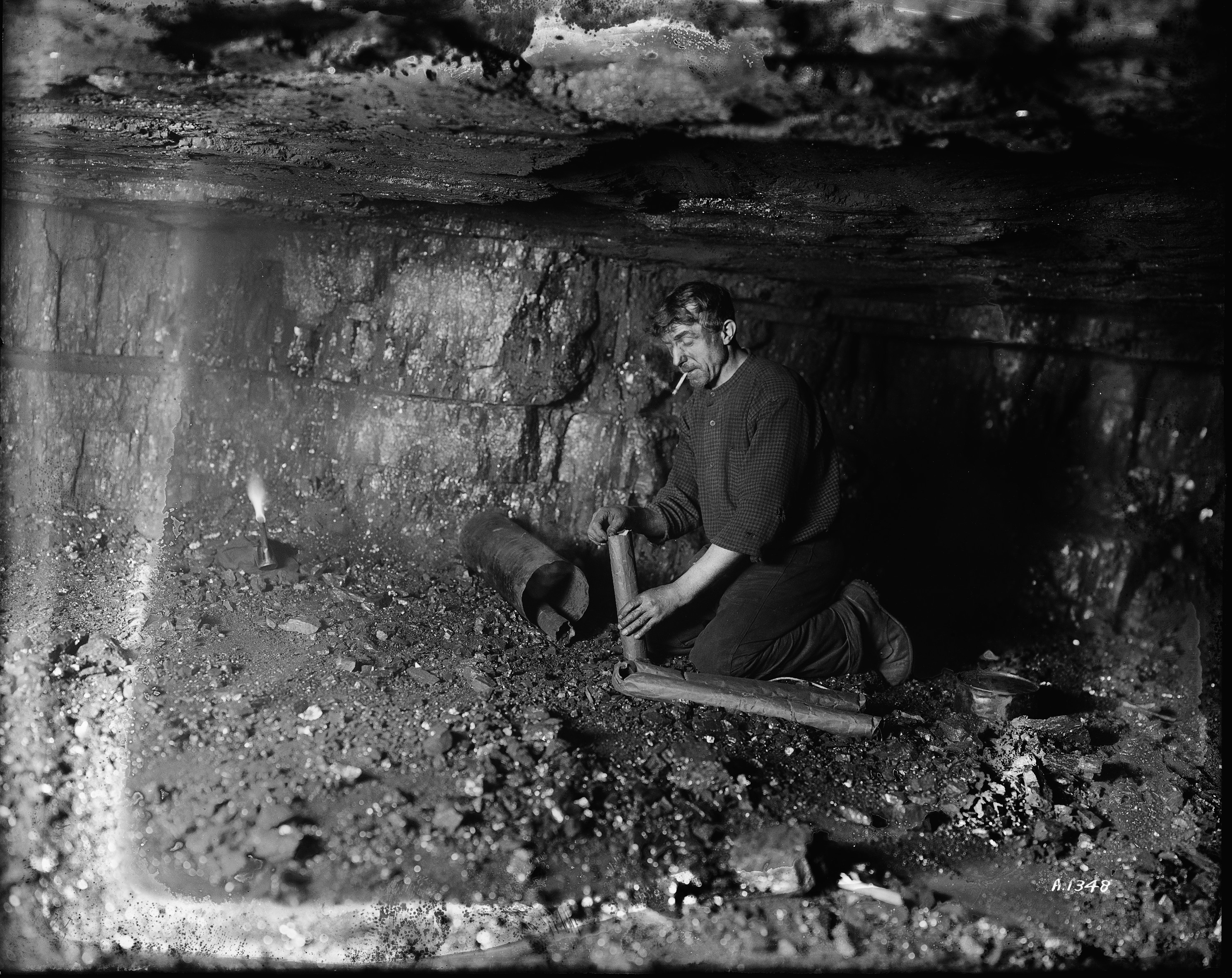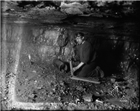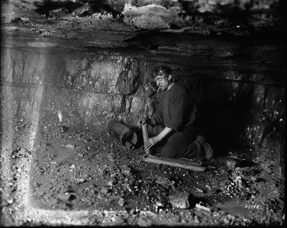 A1348--Unknown location--Miner Preparing Powder with Naked Light on Cap at Distance with Cigar in Mouth [1917]