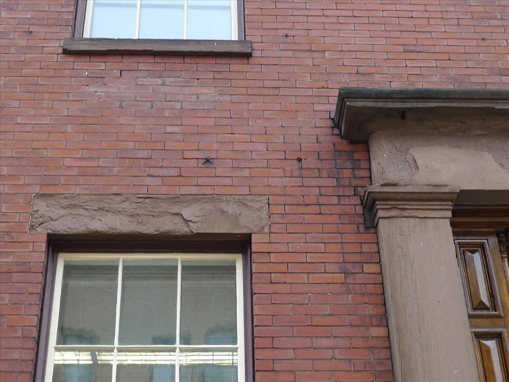 The photograph illustrates the typical exterior brownstone at window openings and door surrounds.