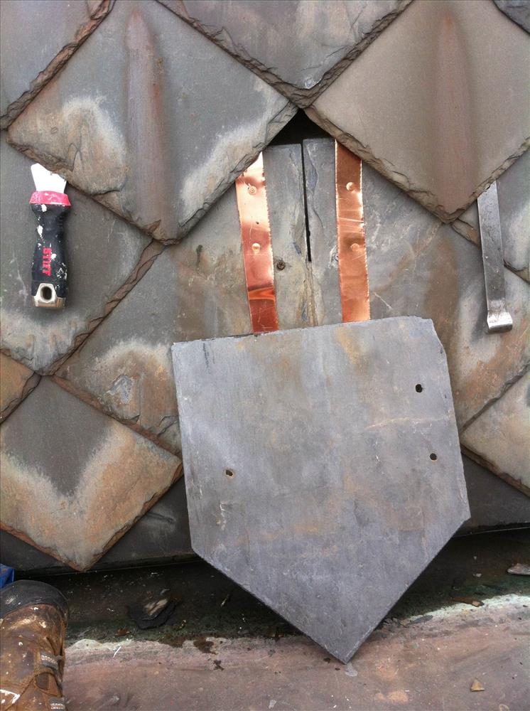 The mansard slate roof of the National Cemetery Lodge exhibits cracked, damaged, or missing slate on 15 percent of the roofs surface. The photos of this project depict the damaged shingles, and the method of repair.