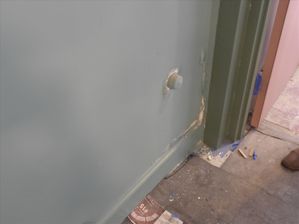 plaster damage inside Fellowship Hall (NW corner) with capped-off pipe of unknown function