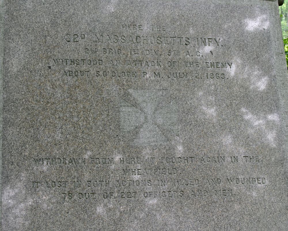 1 of 25 mns in Park honoring MA units at Gettysburg. Marks line held by regiment on July 2, 1863 when attacked by Confederates from Rose Farm. Tablet (1895) marks location of temp field hosptial. Located on S side Sickles Ave, at Loop W of Wheatfield || Mn, 2 flank marker & position marker. Base, 6' sq. Mn in shape of camp tent. 6' high. Inscriptions incised into polished roof of tent. Flank markers, 1'6"x8"x2', gable top w/ inscription on polished face. Hospital marker recessed in native boulder.