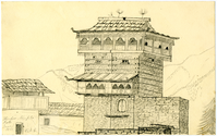 Detailed pencil drawing of temple with square tower and pagoda roof, mountains in background