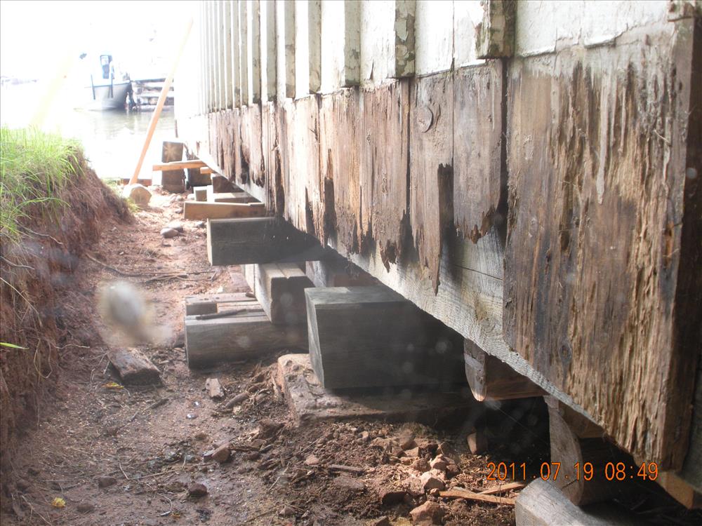 The boathouse was raised up and all deteriorated foundation material was replaced or like new Material was spliced into the old. Floor joist were also replaced or spliced. The grounds the north of the boathouse was contoured to prevent runoff from compromising the building. The doors and windows were repaired. The exterior was painted.