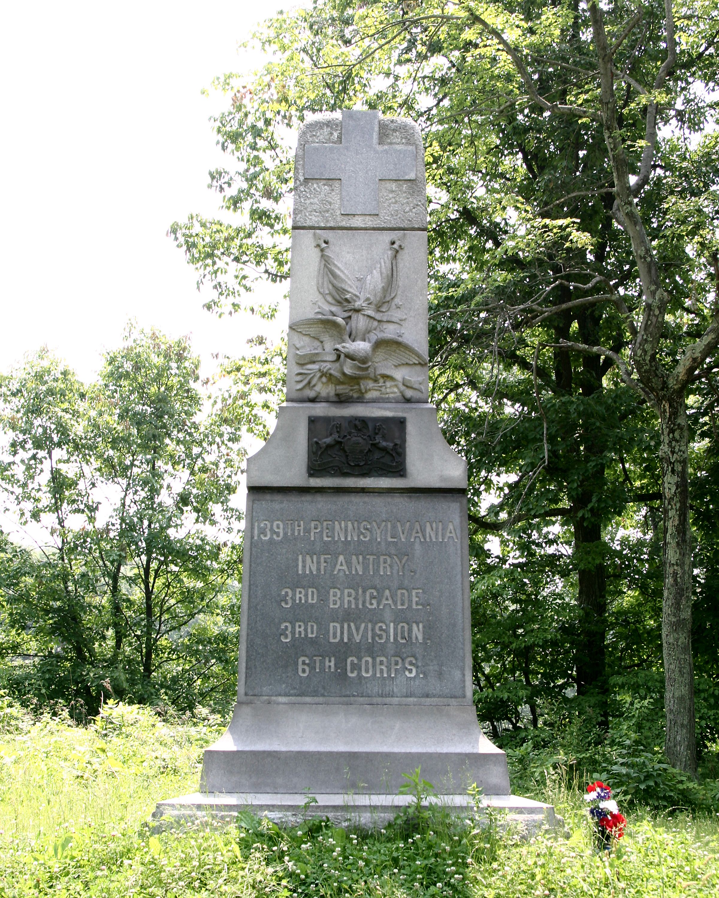 Marks position held by 139th Pennsylvania Infantry from p.m. July 2, 1863 until close of battle. 1 of 110 mns in Park to Pennsyvania commands. Located S end of Althoff/Weikert Farm Lane, N of Wheatfield Rd. in Plum Run Valley. || Mn & 2 flank markers. Rough hewn base, 6'5"x5'4". Shaft 3'11"x2'10", 14'3" high. Inscriptions on polished panels. Relief of crossed flags & eagle, bronze State seal on W face. Relief of cross on all faces cap. Flank markers, flat topped, 1'x1'x1'6".